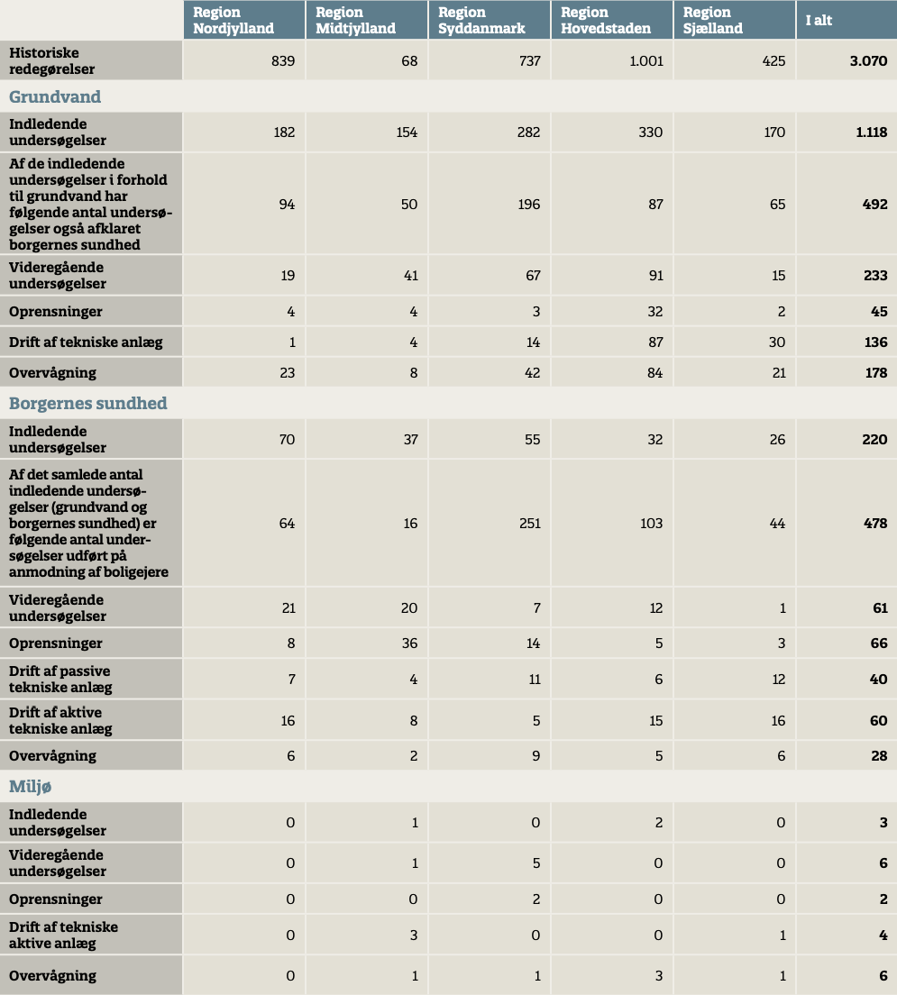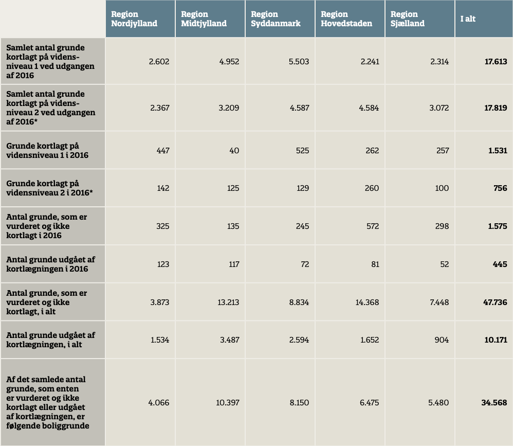 Antal muligt forurenede grunde (kortlagt på vidensniveau 1) og antal forurenede grunde (kortlagt på vidensniveau 2) opgjort dels som i alt ved udgangen af 2016 og dels som det antal grunde, der er kortlagt i 2016. Antal grunde, der er vurderet og ikke kortlagt eller udgået af kortlægningen opgjort dels som i alt ved udgangen af 2016 og dels som antallet for 2016.
