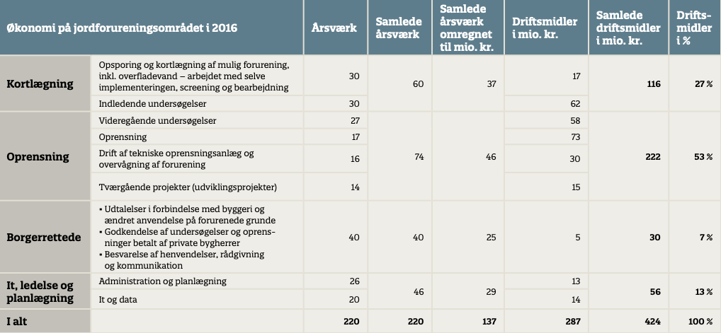 Tabel 16. Økonomien på jordforureningsområdet i 2016