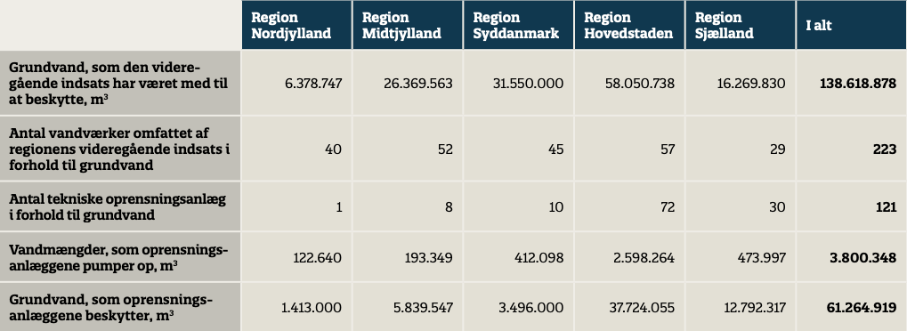 Opgørelse over de vandmængder, som den videregående indsats (videregående undersøgelser, oprensninger og drift af tekniske anlæg) har været med til at beskytte i 2020 (opgjort som vandværkernes indvindingstilladelser). Opgørelsen omfatter den indsats, der er udført i vandværkernes indvindingsoplande (de geografiske områder, hvor vandværkerne henter deres drikkevand). En indsats kan være udført på en grund, der ligger i mere end ét indvindingsopland og dermed være med til at beskytte grundvandet i flere indvindingsoplande. De vandmængder, de tekniske oprensningsanlæg i vandværkernes indvindingsoplande har været med til at beskytte, er også opgjort (opgjort som vandværkernes indvindingstilladelser).