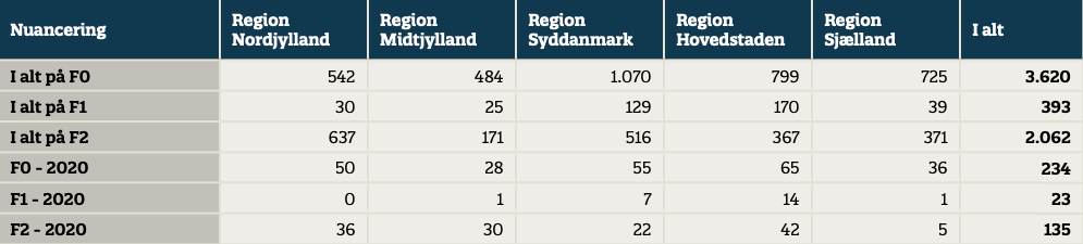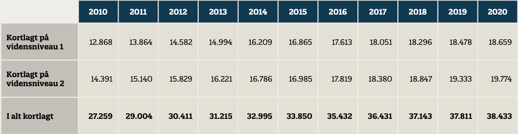 Antallet er opgjort som antal aktive sager i 2020, det vil sige nye sager, der er startet op i 2020 og sager, der er videreført fra tidligere år. Nogle af sagerne er afsluttet i 2020. Sagerne er også talt med i tabel 5, som indeholder den samlede offentlige indsats i 2020.