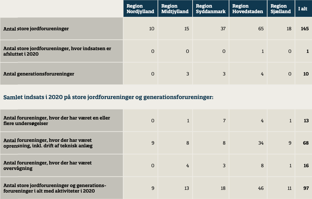 Tabel 13. Indsatsen på de store jordforureninger og generationsforureninger i 2020