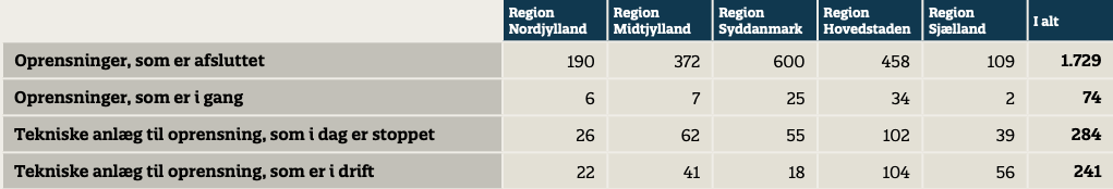 Antal oprensninger, som de daværende amter og regionerne har gennemført eller er i gang med at gennemføre, og antal tekniske anlæg til oprensning, som har været eller fortsat er i drift. Antallet af oprensninger, som er afsluttet, kan være for højt, da det ikke har været muligt at frasortere samtlige privatfinansierede oprensninger. Det skyldes den måde, data fra før 2007 er opsamlet og registeret på.