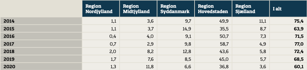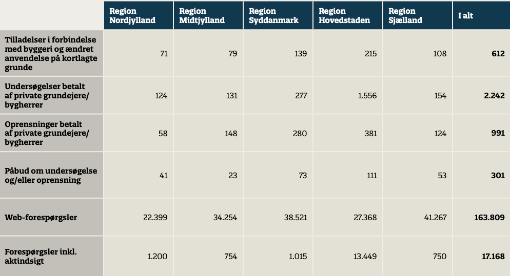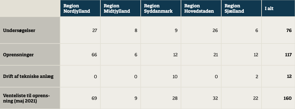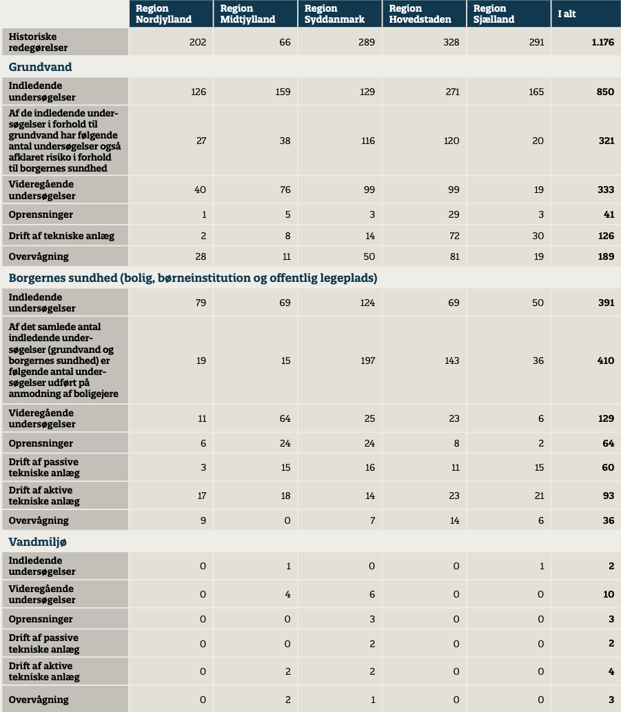 Antallet er opgjort som antal aktive sager i 2020, det vil sige nye sager, der er startet op i 2020 og sager, der er videreført fra tidligere år. Nogle af sagerne er afsluttet i 2020. Tabellen indeholder også oplysninger om, hvor mange grunde der afventer oprensning efter værditabsordningen.