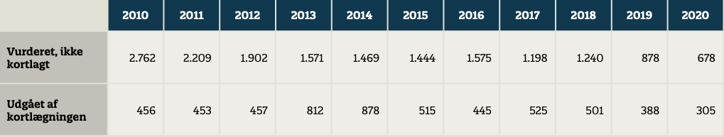 Tabel 2. Udviklingen i antallet af kortlagte grunde i perioden 2010-2020
