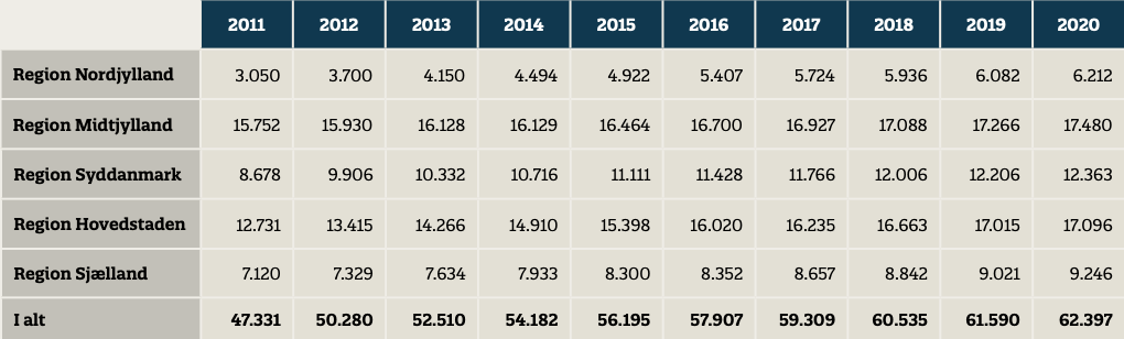 Antallet er opgjort som antal aktive sager i 2020, det vil sige nye sager, der er startet op i 2020 og sager, der er